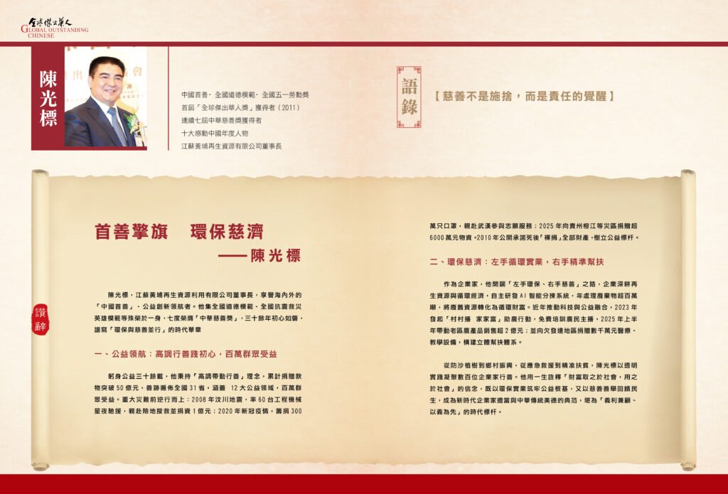 陳光標先生是江蘇黃埔再生資源利用有限公司董事長,被譽為 「中國環保產業領跑者」 。他極具前瞻性地將商業目光投向 「變廢為寶」的綠色循環經濟領域,開創了一條商業與公益相輔相成的傳奇之路。