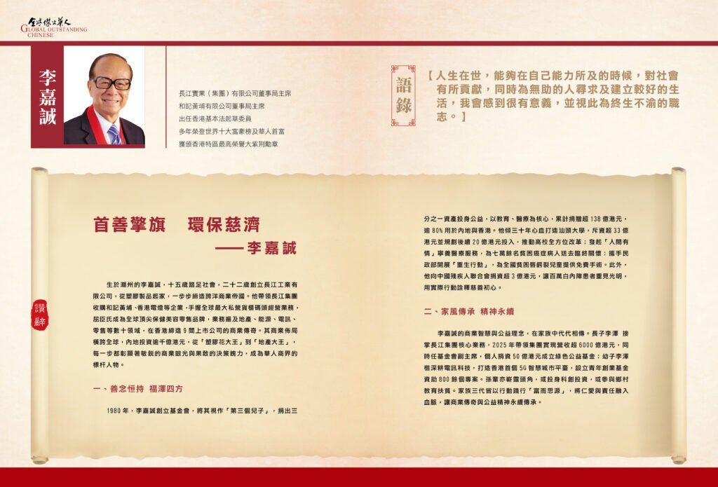 2018 年全面接掌長和系商業王國,風格穩健務實,積極帶領集團向新能源及數碼基建轉型。亦接棒汕頭大學校董會名譽主席一職,延續父親的教育公益使命。