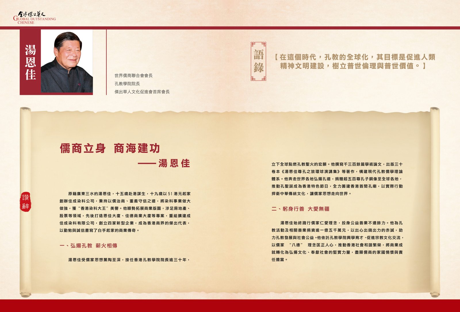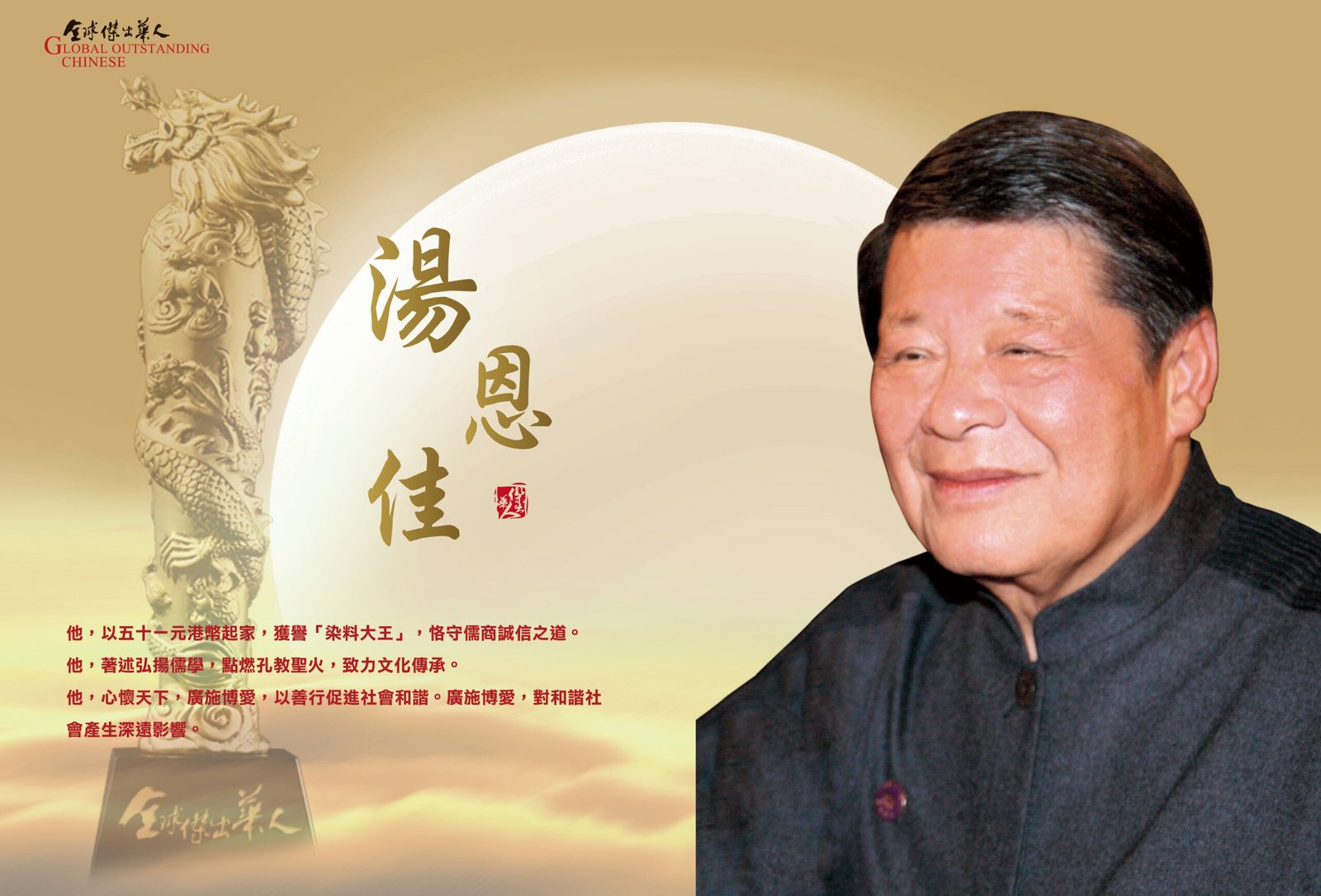 湯恩佳博士,1934 年生,祖籍廣東佛山三水,持有美國愛奧華威斯理安大學榮譽博士學位。年輕時白手起家,憑藉過人的商業敏銳度在香港建立起龐大的染料王國,躋身工商界翹楚。然而在事業如日中天之時,他毅然做出了令香港商界嘩然的決定——以 51 歲之齡急流勇退,放下千億財富,終身投入弘揚孔子儒學,成就了 20 世紀最震撼人心的棄商從儒傳奇。