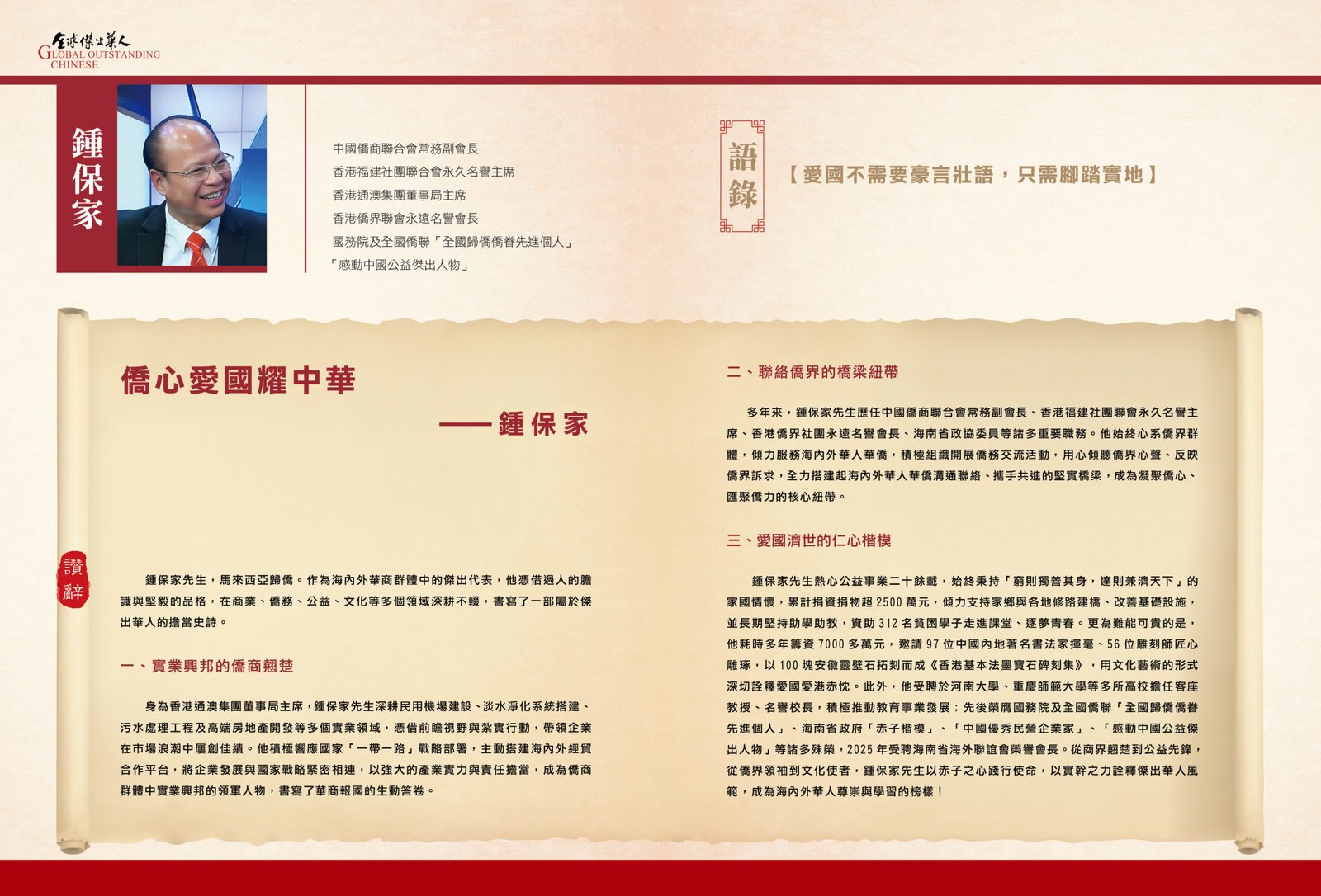 鐘保家先生祖籍福建泉州,1957 年生於馬來西亞檳城,1964 年隨父回國定居泉港。他從基層工程隊長起步,歷經澳門地產行業磨煉,最終在海南五指山少數民族地區紮根,開啟了一段橫跨港、澳、閩、瓊、豫的商業傳奇。
